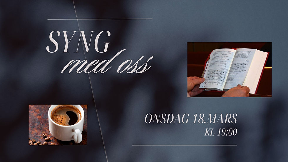 Syng med oss 18.3🎶1. feb.1 min lesingKom og syng med oss! Onsdag 18. mars, kl 19:00 Vi synger gode kristne klassiske salmer og lovsanger.Kaffe og kaker serveres i pausen ☕